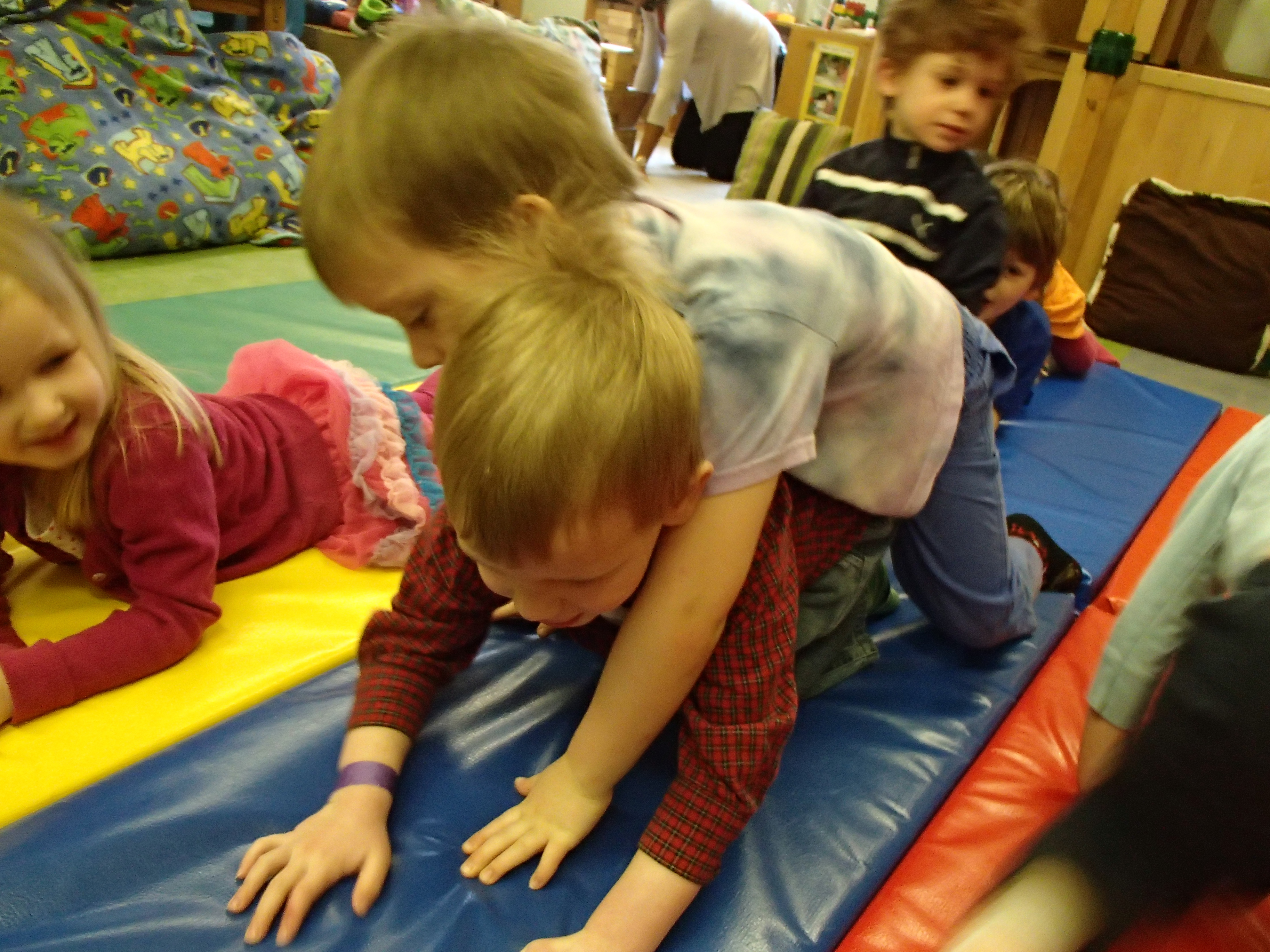 Usually this refers to the way some boys engage in rough-and-tumble play for much of the day and girls don’t. When I talk to other teachers who allow and encourage rough-and-tumble play, I get a very different picture. We all agree that big body play or rough-and-tumble play seems fairly mixed gender-wise. I have 8 boys and 2 girls in my preschool class this year, but about half the time someone asks me to get out the mats for roughhousing, it is a girl. When kids are piled on top of each other, there are girls and boys in the mix.
