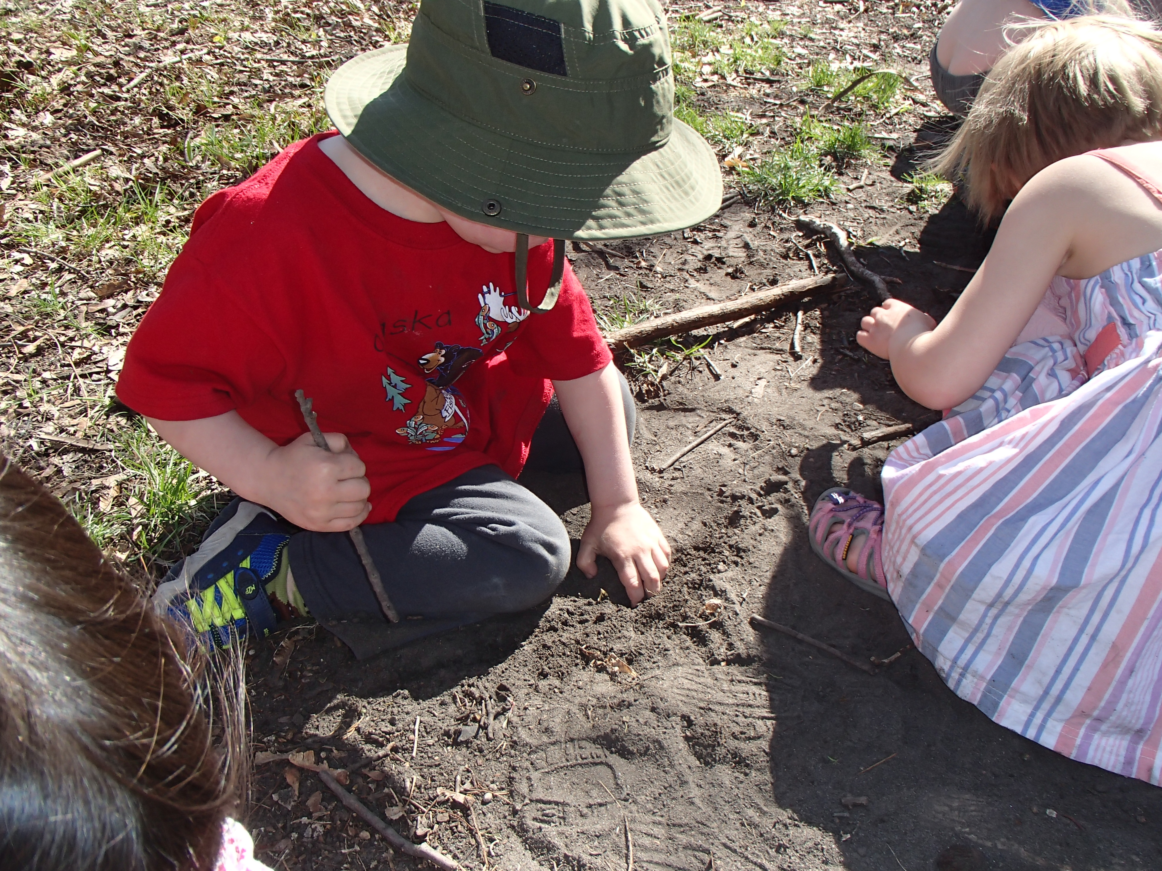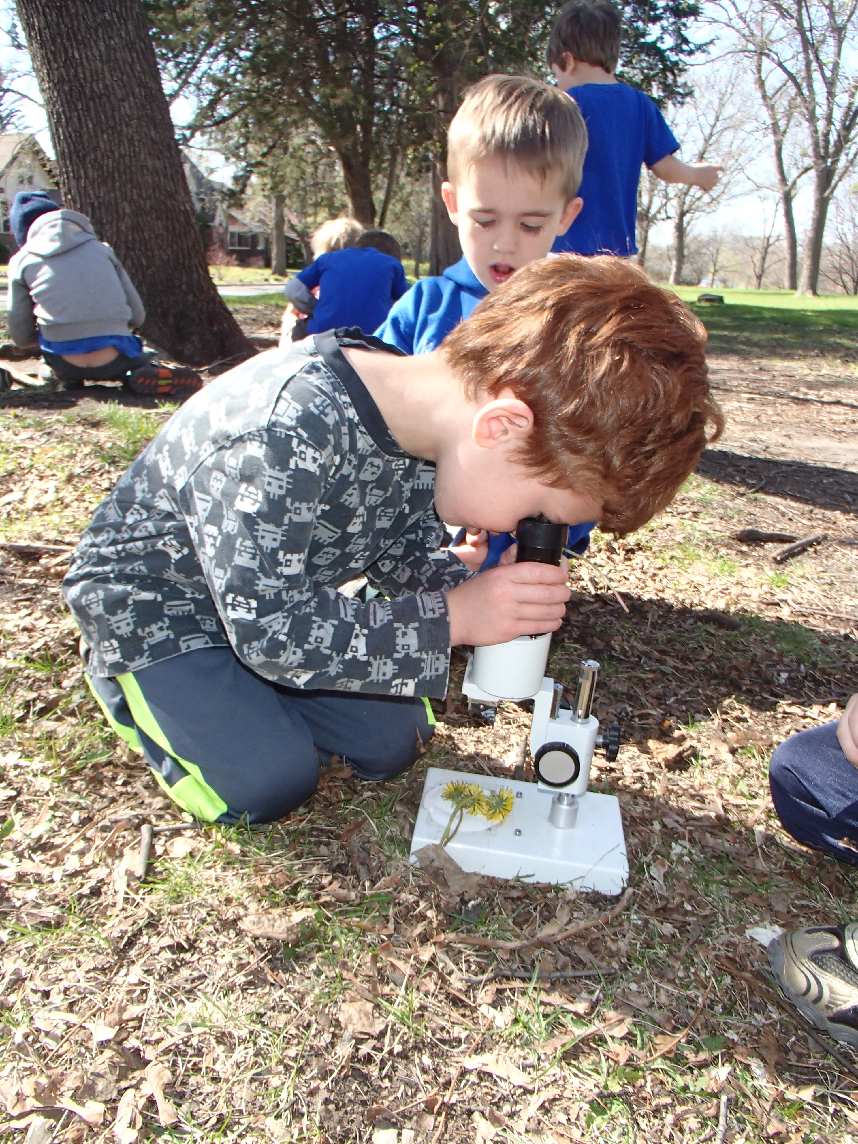 If children are going to be scientist, they also need tools. Tools can help children see things they can’t see otherwise. Magnifying glasses are often provided, but I have found that they don’t provide much that a child can’t see by looking closer. On the other hand, a portable stereo microscope is fairly inexpensive and can be brought outside. Unlike compound microscopes, which require specimens to be mounted on slides, stereo microscopes allow the specimen to be simply placed under the lens. Worms and insects can crawl under. Pine cones, leaves, or any object under four inches in width can fit and the lenses can be focused on different parts of the object. Children can often see patterns on wings and leaves invisible to the naked eye. For younger children who may have a hard time looking into the microscope, you can hold a camera to one of the eyepieces and children can look at the camera’s screen.
