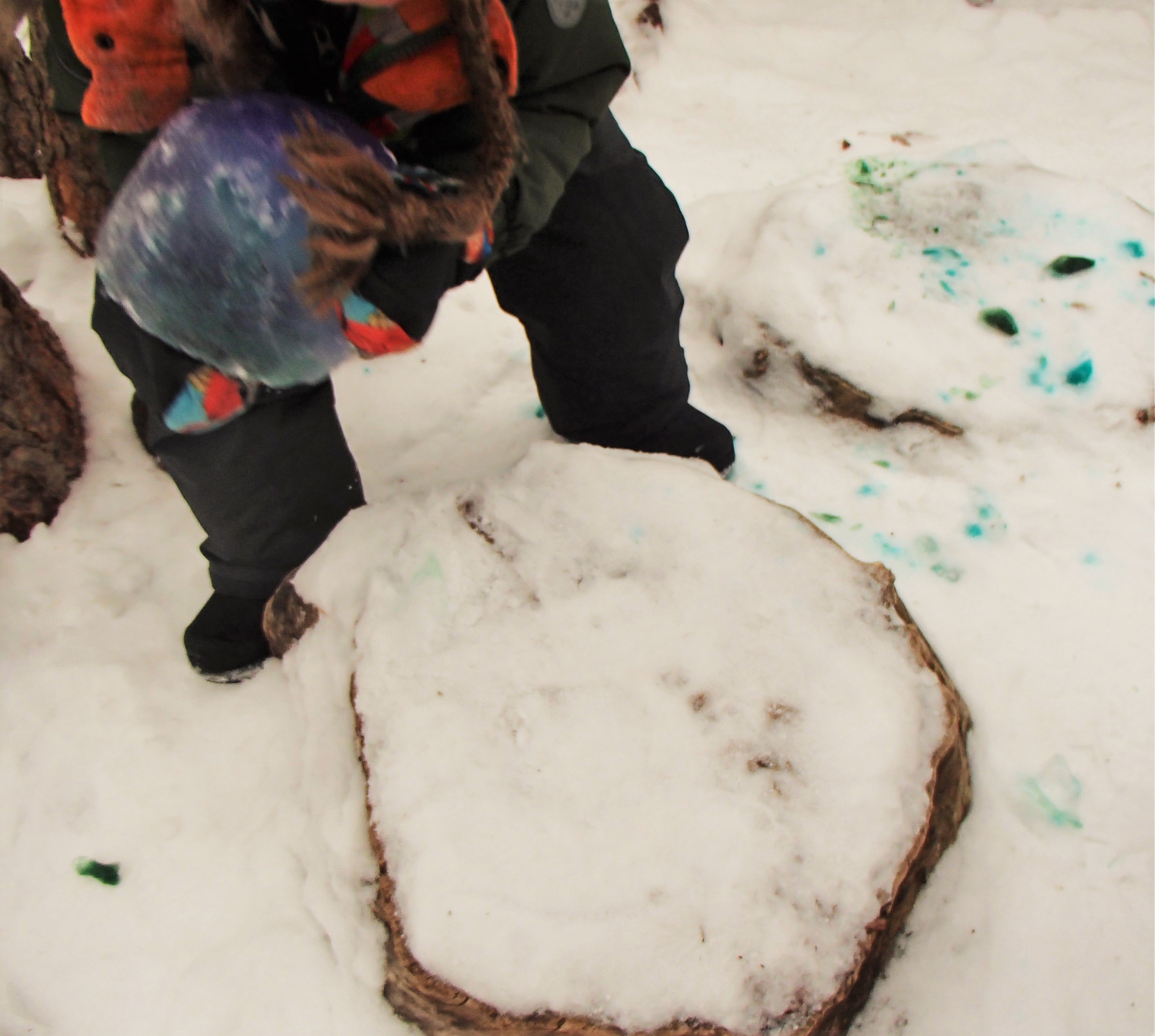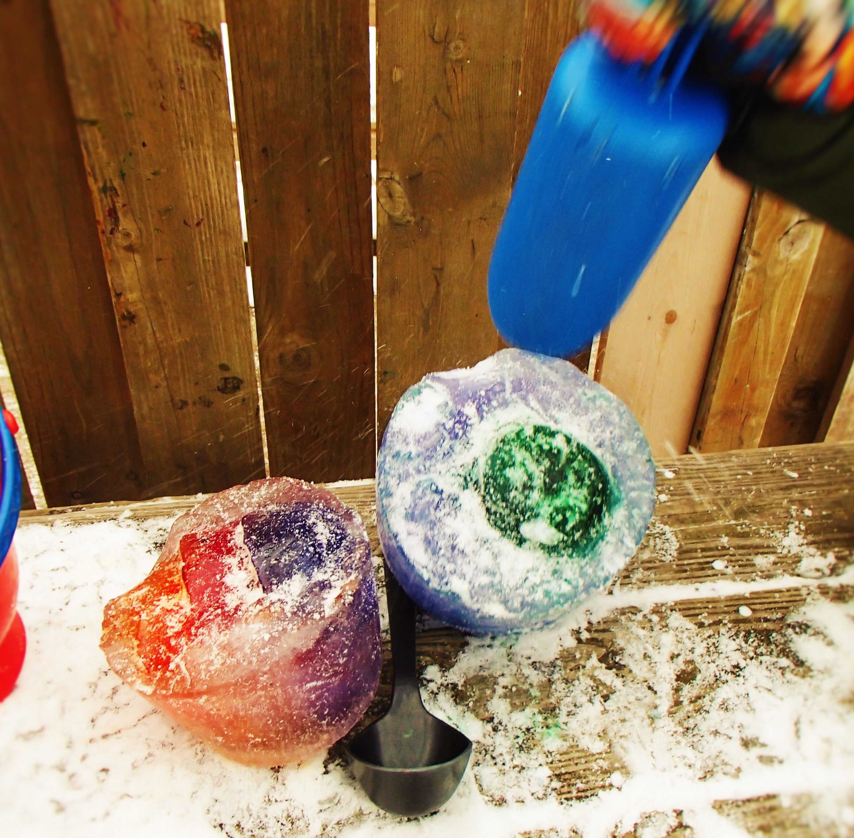 On Monday I had the ice chunks spread throughout the playground. A few children called them “magic crystals,” which they quickly collected in a crate. Lance found a large ice chunk about 6 inches across. I was curious what he would do with it. I followed him across the playground. Lance lifted the ice over his head, and threw it on a tree stump.