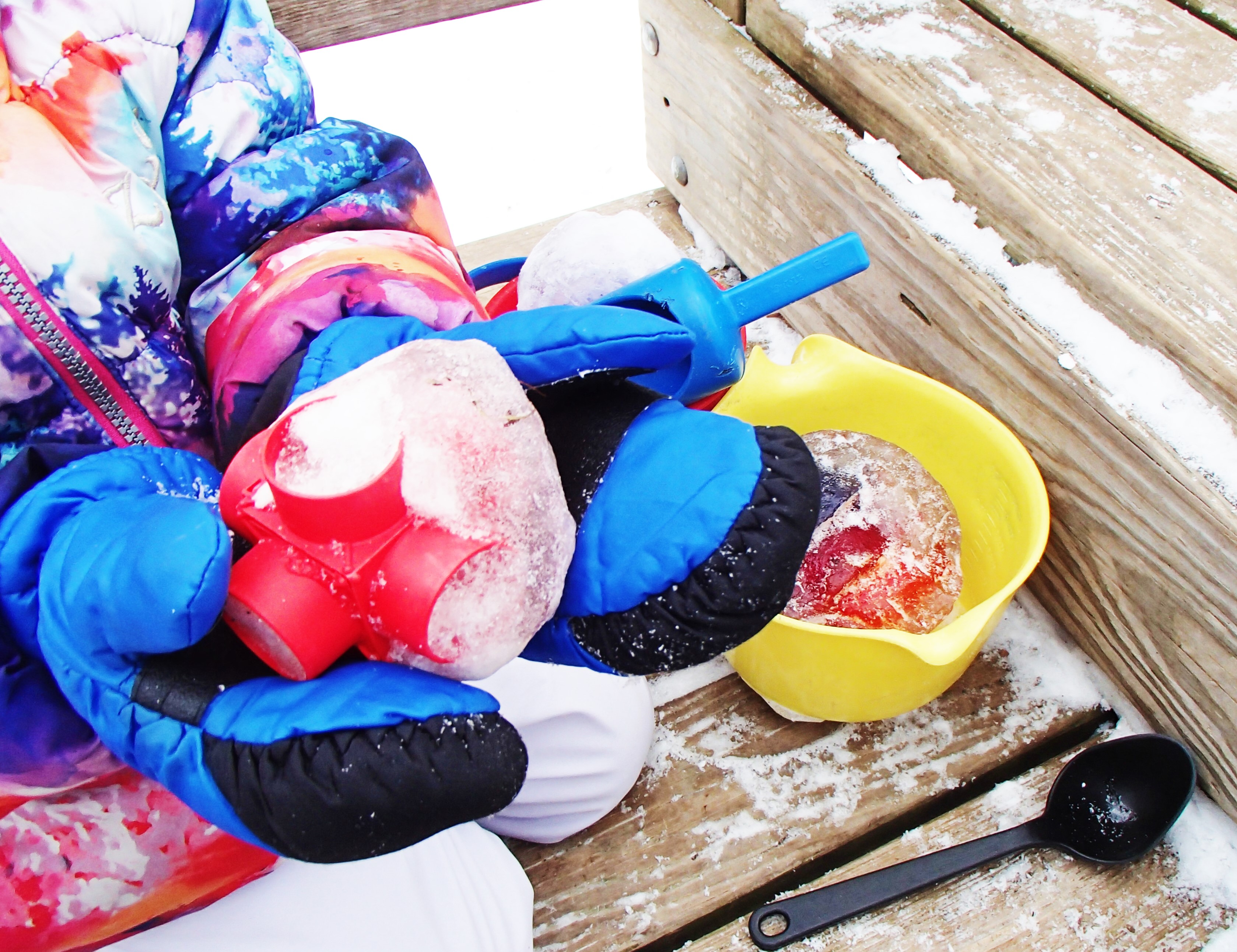 This winter we haven’t had very much snow. The last two weeks have been very cold and the snow is packed hard on the ground or has turned to ice. We can still sled, but it has been hard to play with other materials. It’s hard to run or roughhouse when the ground is hard and slippery. It’s hard to use materials when your hands are encased in mittens.
